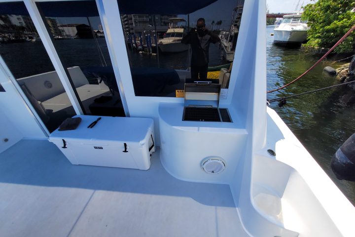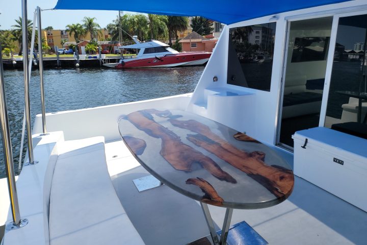 Enjoy our Luxury Power Catamaran with a huge sundeck and toys for up to 12 people. This vessel features over 800 feet of deck space and a 20 X 18-foot sundeck with cushions for tanning so everyone can be there at once. the open kitchen concept makes it easy to do a buffet and heats up the food. on the aft, we have a small grill for the BBQ. You can order all your favorites and we will arrange for a delivery or bring it yourself. toys.